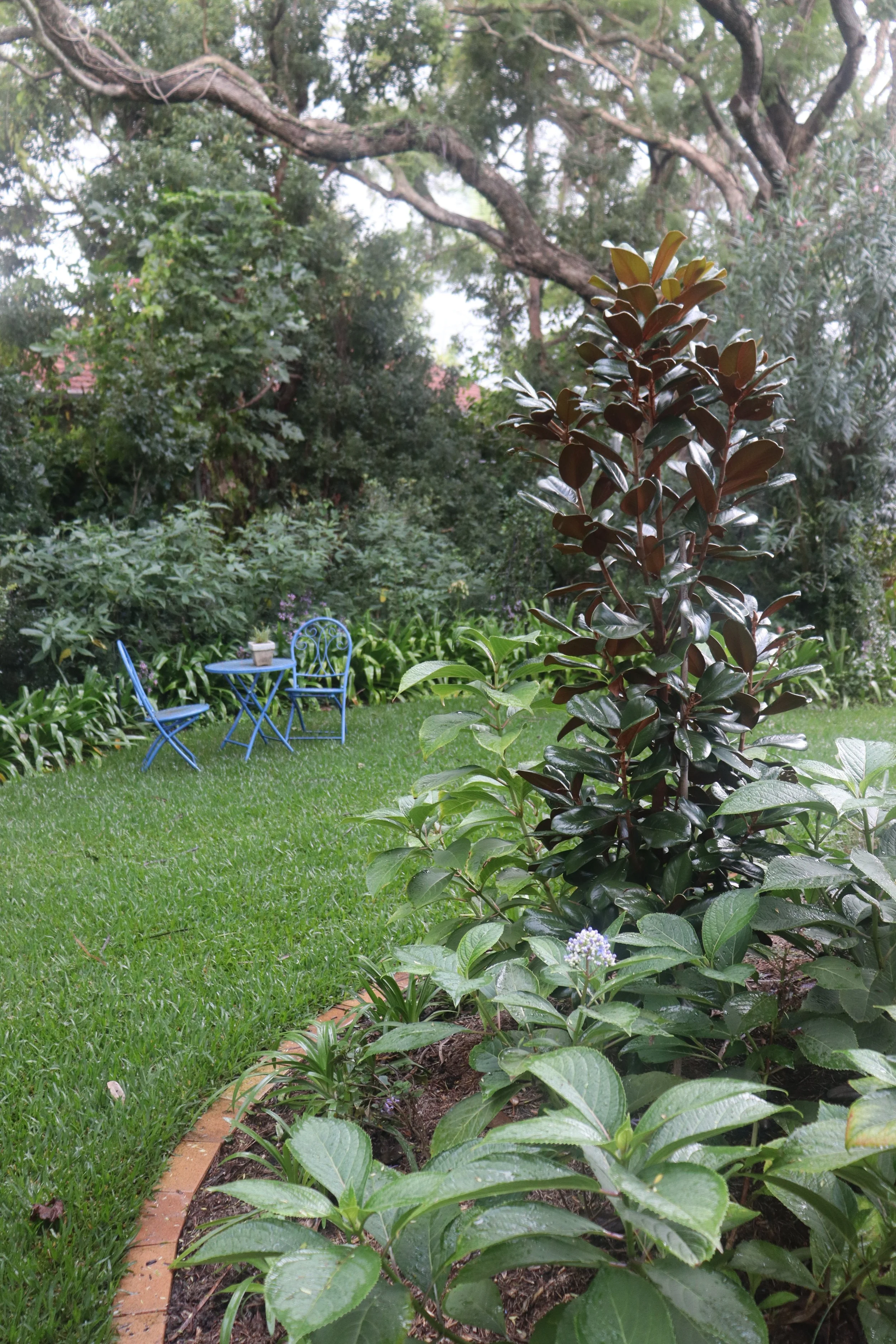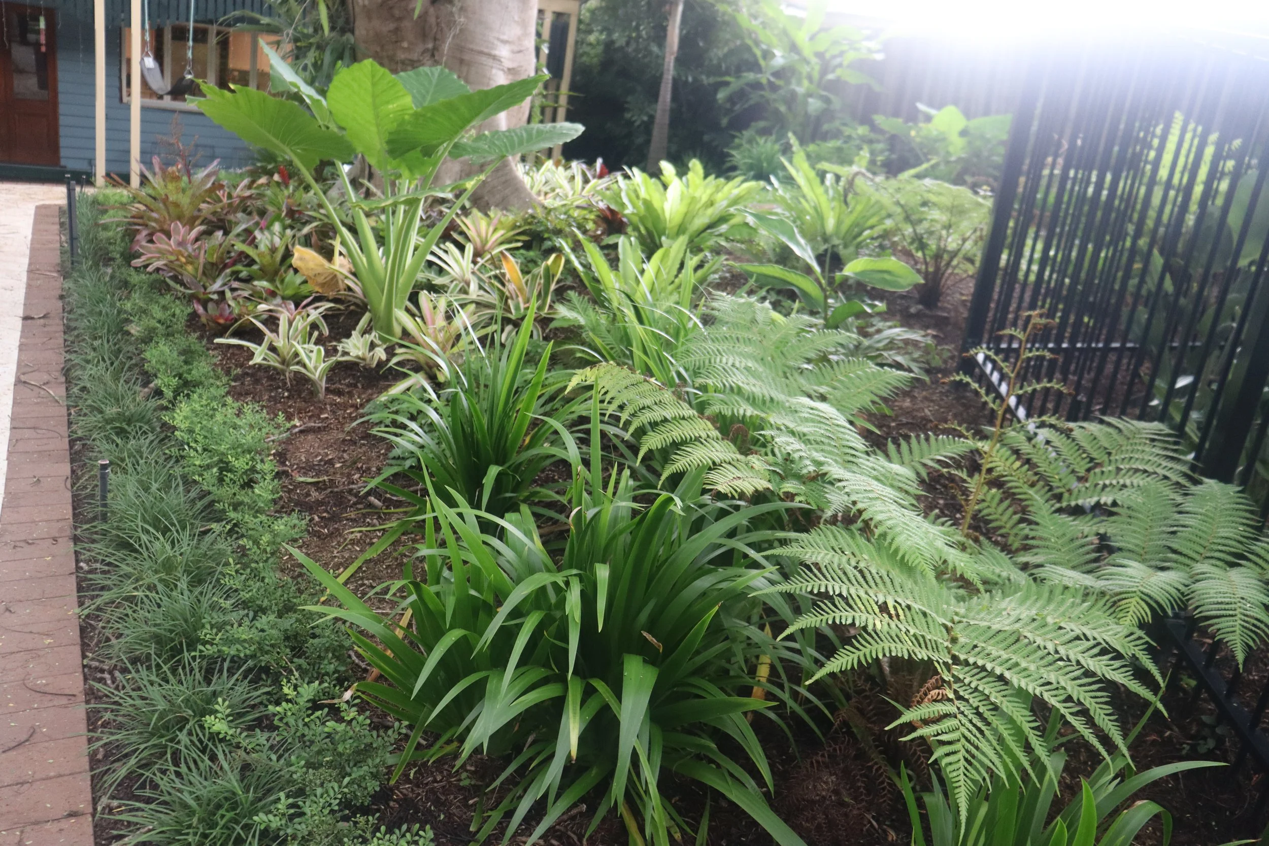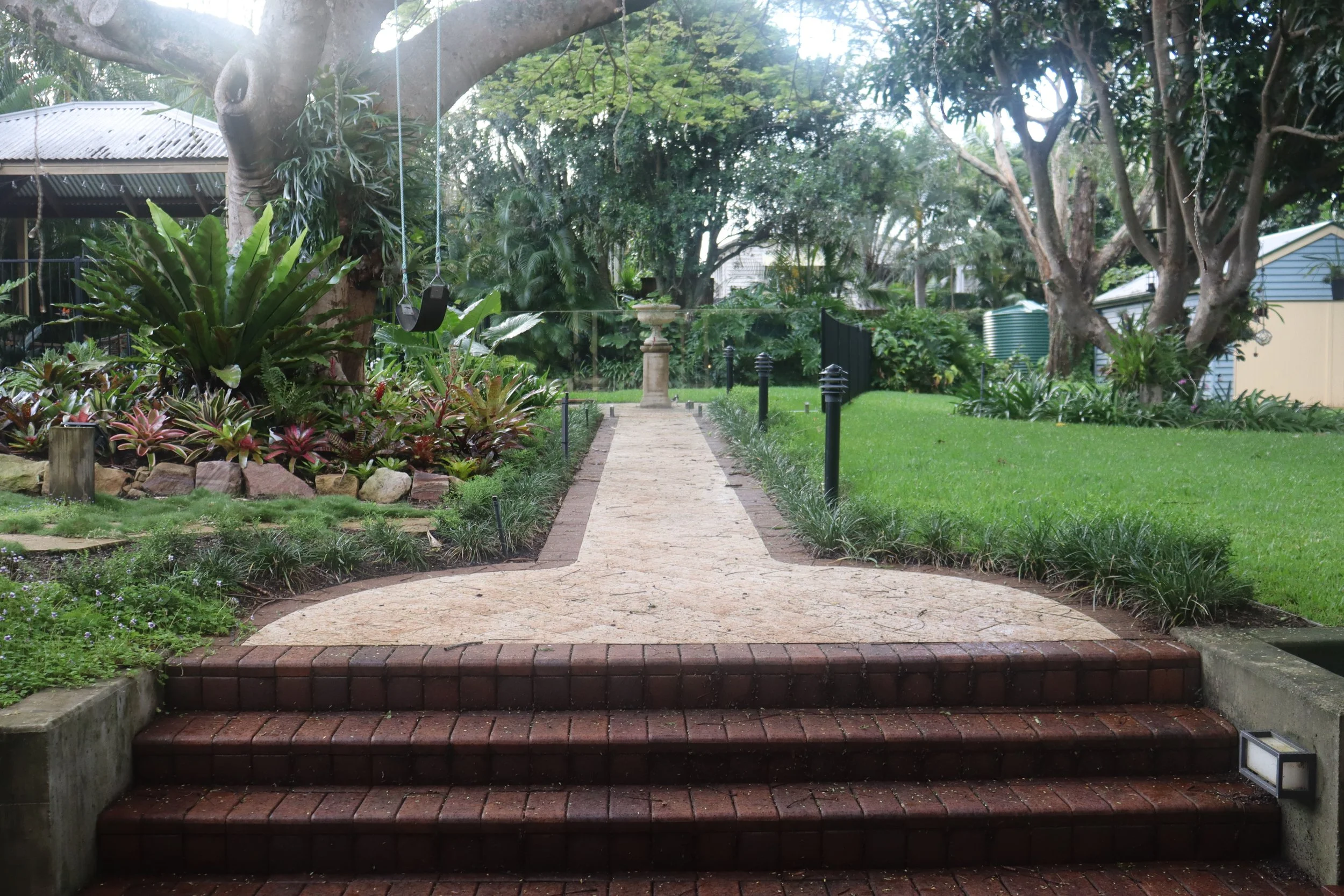 A beautifully renovated original Queenslander home in Nundah needed the garden to compliment it. With an existing tired central path to the pool and cabana as a focal point, this garden had good structure to work with. The overgrown gardens were removed to make way for the creation of some intimate spaces to be enjoyed by the whole family. The central path was raised to accommodate the tree roots that were disrupting it, re-laid on concrete with stone tiling. The original brick edging was kept as the link to the existing inlaid prick on the patio and steps. The planting plan utilised plants that were hiding in the old overgrown garden as well as some new features like the Teddy Bear Magnolia and the Liriope Emerald Cascade lining the path. The Sioux Crepe Myrtle, Evergreen Hydrangea, Pink Malay, Mona Lavender and Agapanthus next to the lower patio created the floral garden the owner desired, without much maintenance.