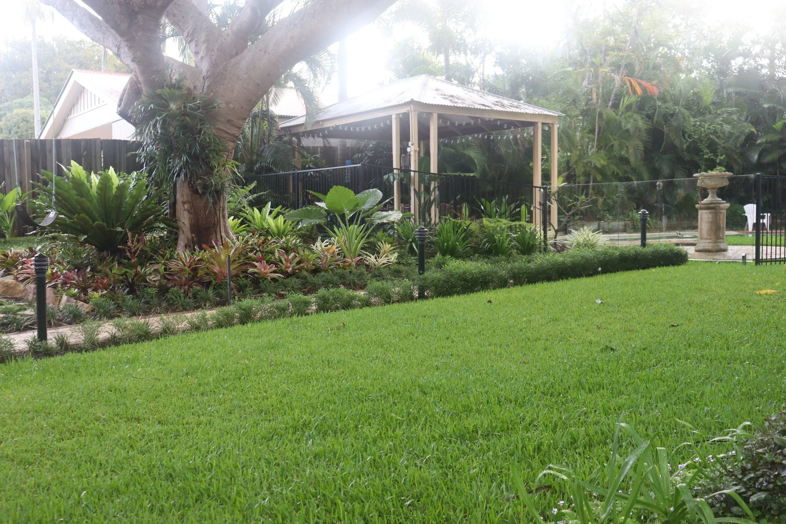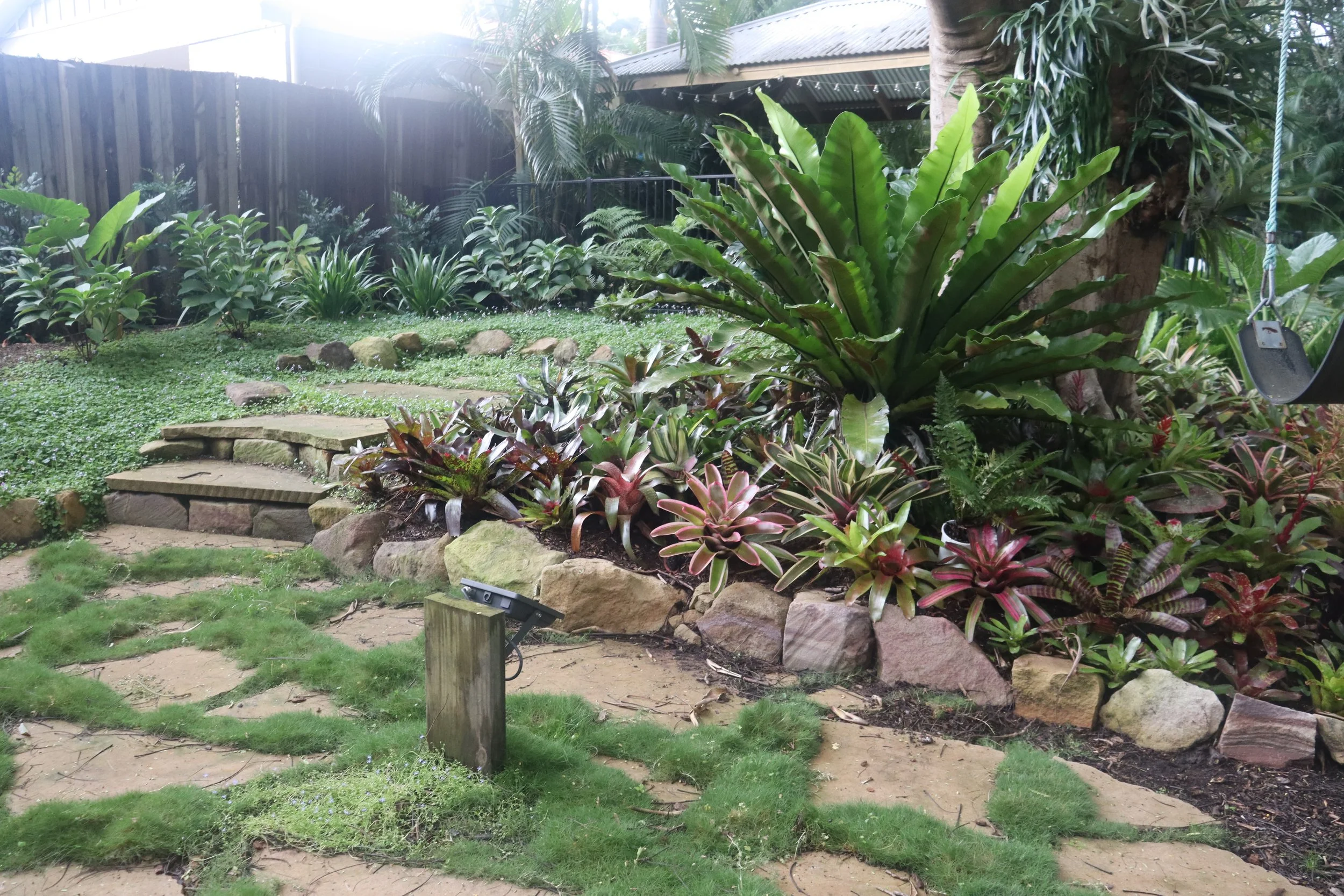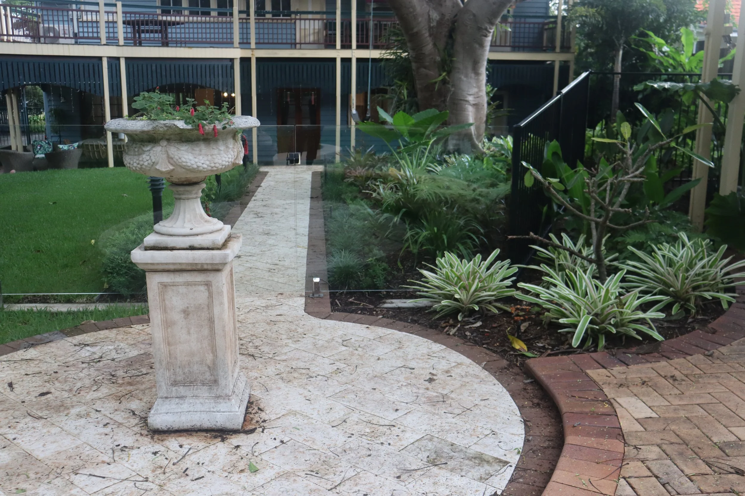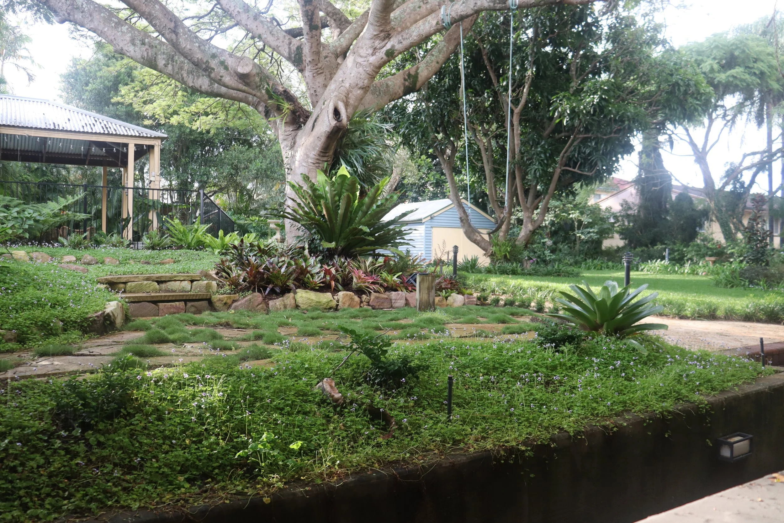 A beautifully renovated original Queenslander home in Nundah needed the garden to compliment it. With an existing tired central path to the pool and cabana as a focal point, this garden had good structure to work with. The overgrown gardens were removed to make way for the creation of some intimate spaces to be enjoyed by the whole family. The central path was raised to accommodate the tree roots that were disrupting it, re-laid on concrete with stone tiling. The original brick edging was kept as the link to the existing inlaid prick on the patio and steps. The planting plan utilised plants that were hiding in the old overgrown garden as well as some new features like the Teddy Bear Magnolia and the Liriope Emerald Cascade lining the path. The Sioux Crepe Myrtle, Evergreen Hydrangea, Pink Malay, Mona Lavender and Agapanthus next to the lower patio created the floral garden the owner desired, without much maintenance.